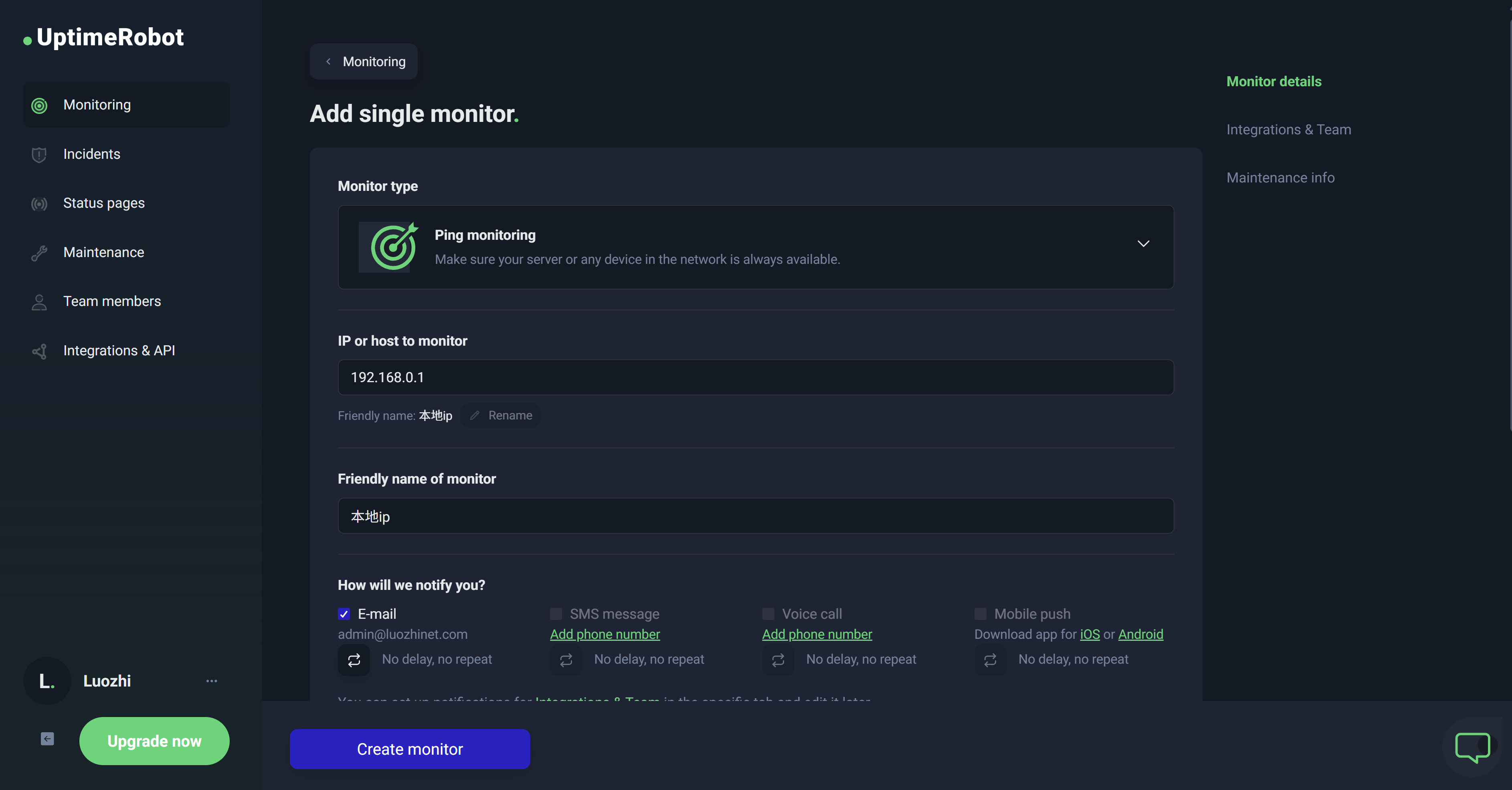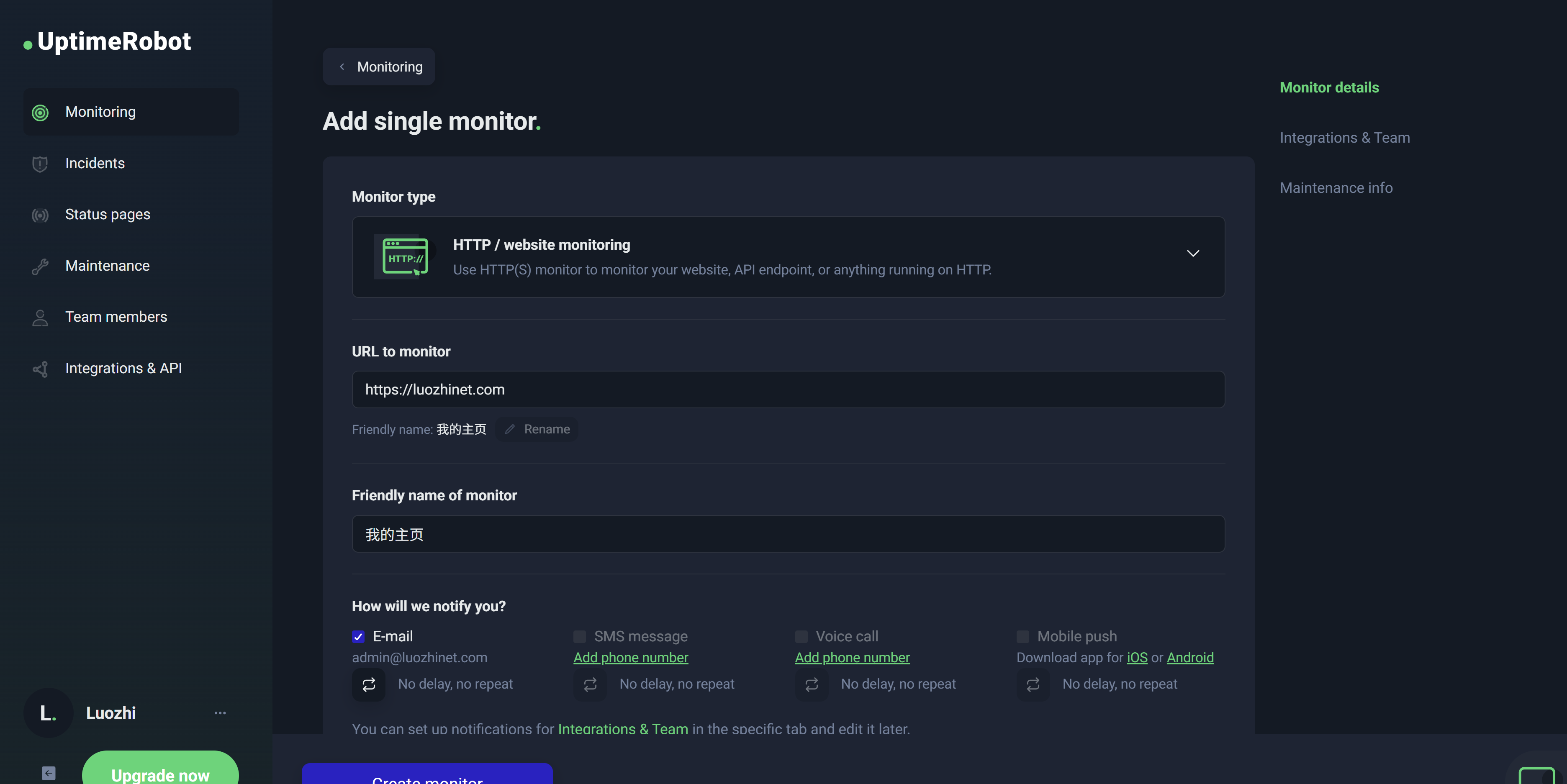 有四种监控方式,分别为Http(s)、Ping、Port、Keyword,在这里我选择Http(s)来监控我的网站,选择Ping来监控我的服务器。Port一般用于VPS监控。