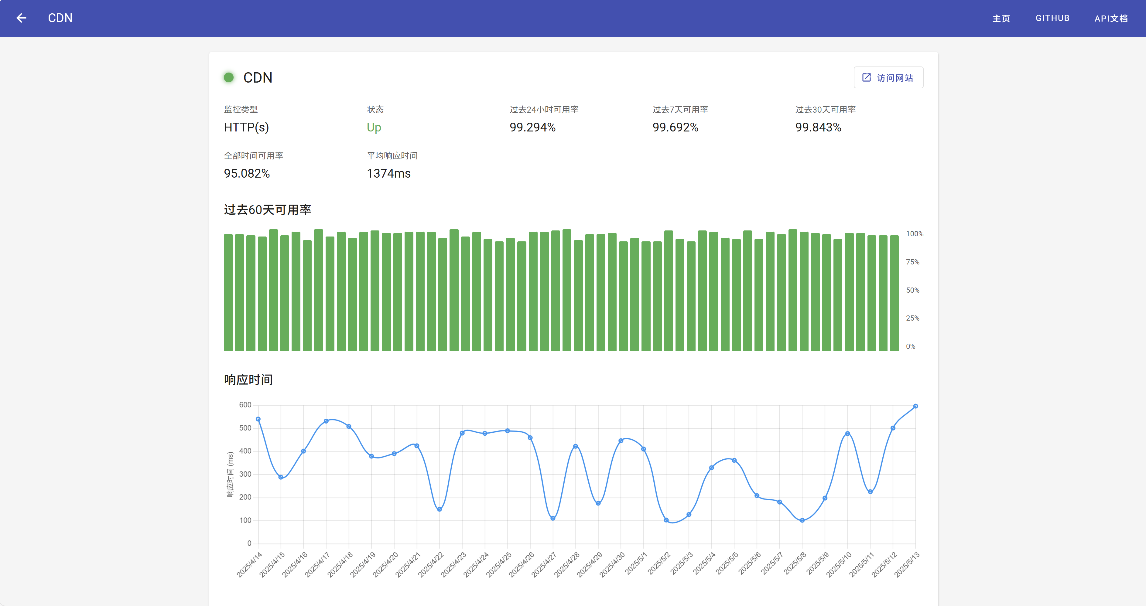 - 使用 Chart.js 绘制可用率和响应时间曲线,直观展示历史趋势